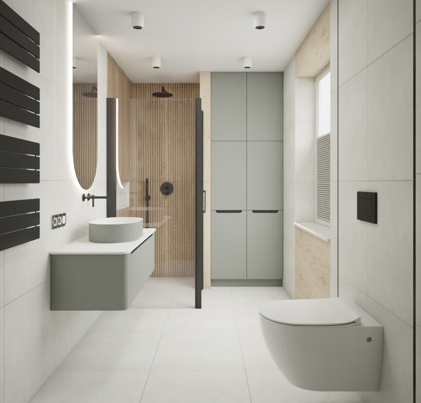 Projektując tę przestrzeń, skupiłam się na rozwiązaniach, które mają ułatwiać codzienność. Pojemna zabudowa do sufitu zapewnia miejsce na przechowywanie wszystkiego, co chcemy mieć pod ręką, bez wprowadzania chaosu wizualnego. Umywalka osadzona na minimalistycznej szafce tworzy wygodny blat, a prysznic typu walk-in z czarnymi detalami dodaje lekkości i elegancji. Oświetlenie warstwowe pozwala korzystać z łazienki zarówno w trybie praktycznym, jak i relaksacyjnym.