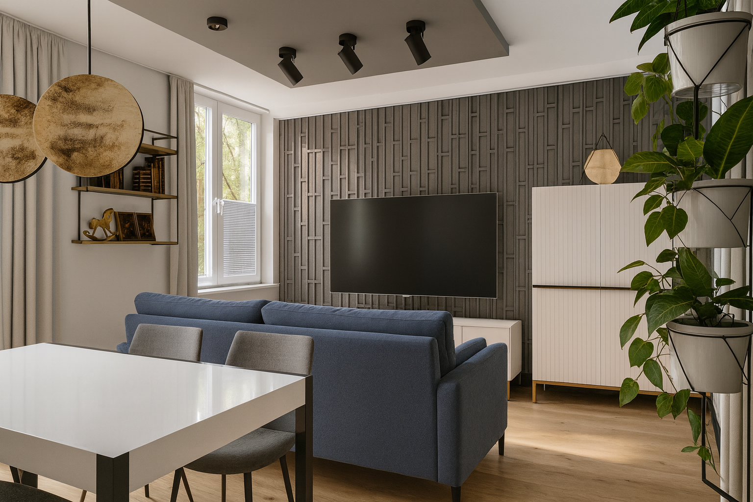 Tego typu aranżacja to propozycja dla osób, które szukają nowoczesnych, ale przytulnych rozwiązań. Połączenie betonu architektonicznego, złotych akcentów i zieleni roślin sprawia, że wnętrze staje się eleganckie, a jednocześnie komfortowe. To inspiracja dla każdego, kto marzy o salonie urządzonym z klasą.