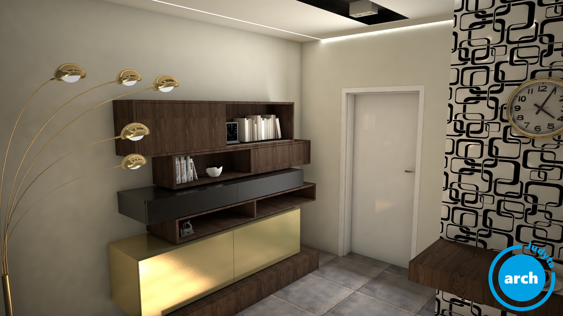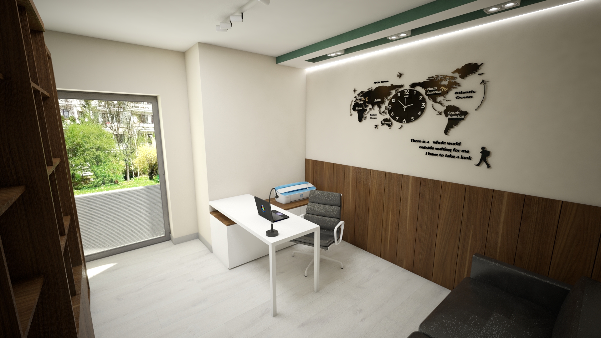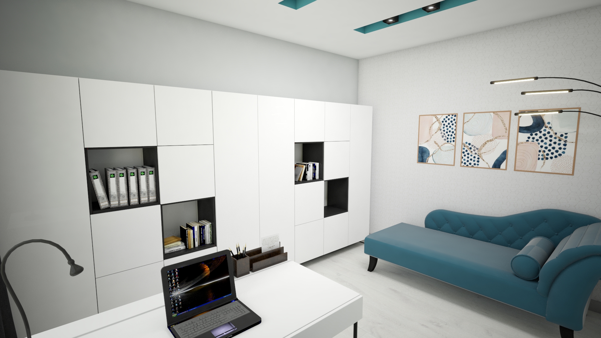 003. domowe biuro niebieskie beton jasne drewno projektor telewizor komputer home office blue concrete light wood projector televison computer
