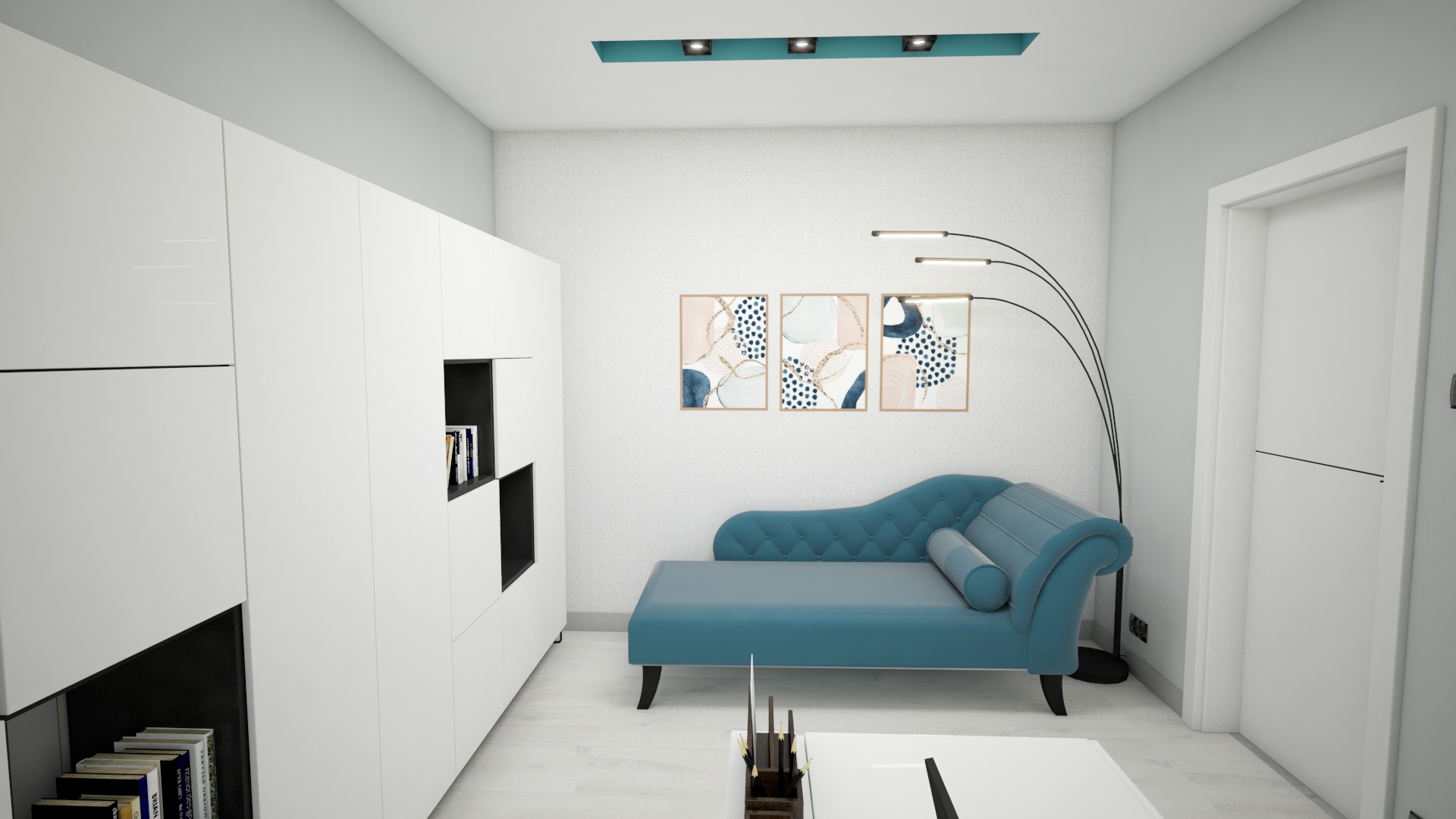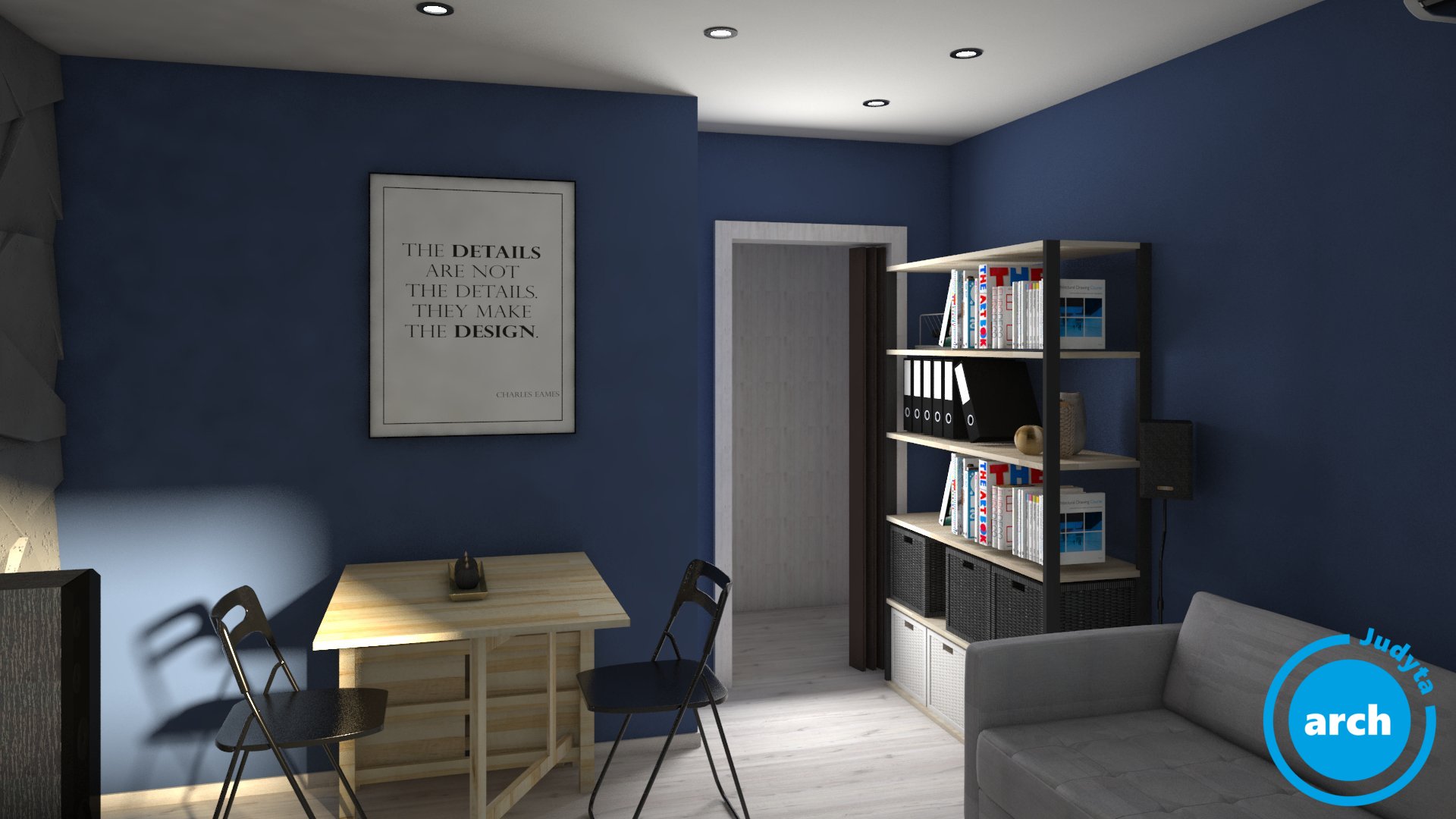 004. domowe biuro niebieskie beton jasne drewno projektor telewizor komputer home office blue concrete light wood projector televison computer