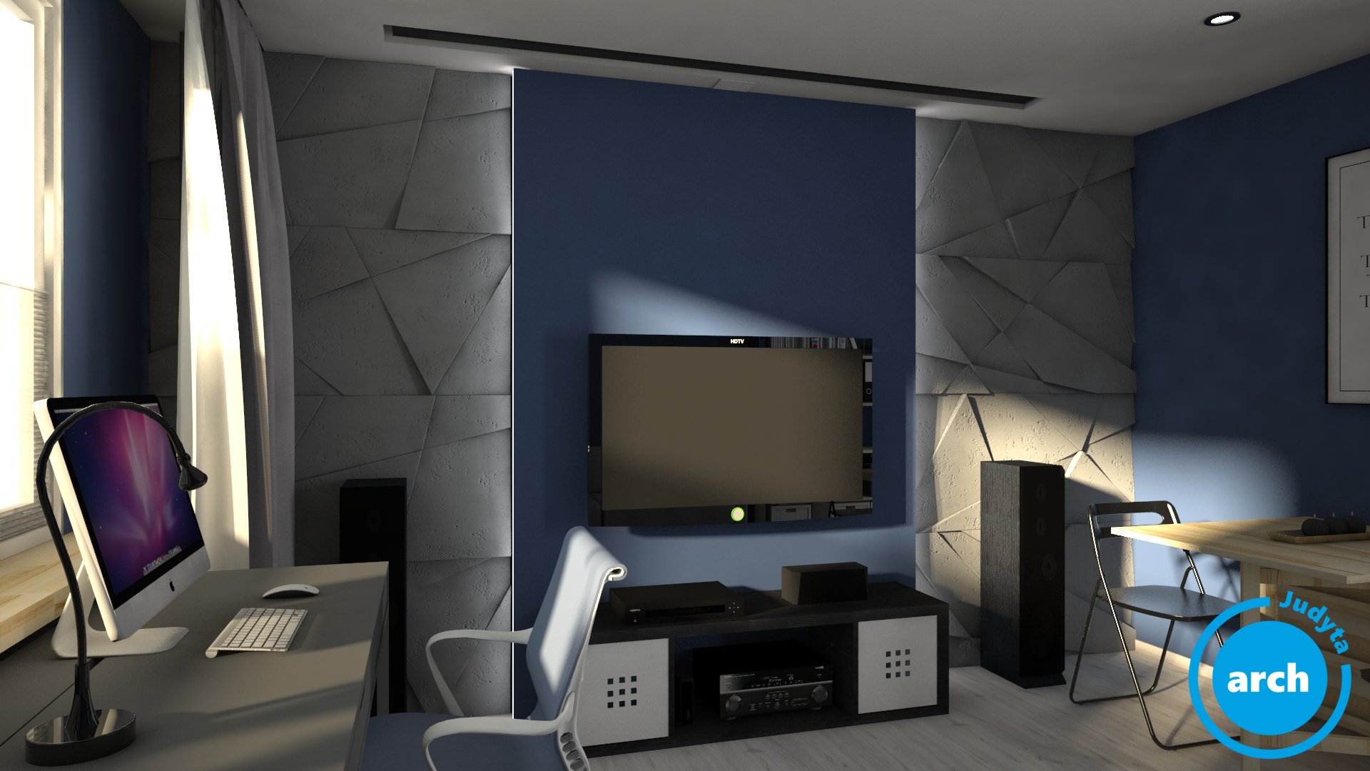 005. domowe biuro niebieskie beton jasne drewno projektor telewizor komputer home office blue concrete light wood projector televison computer