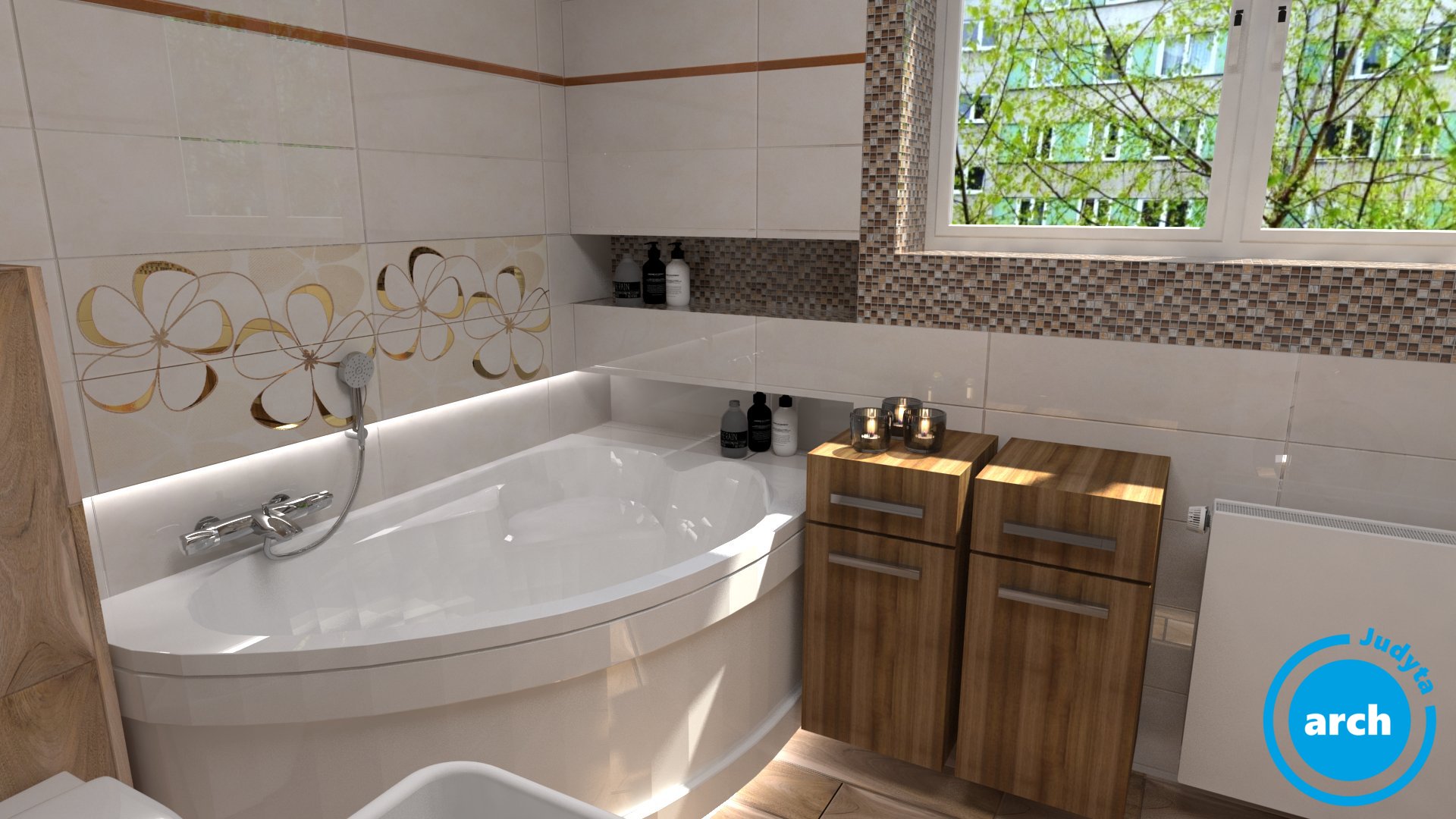 135. lazienka z wanna i prysznicem bezowa hexagony biale kwiatki drewno zabudowa pralki bathroom with bath and shower beige hexagons white flowers wood furniture construction of the washing machine