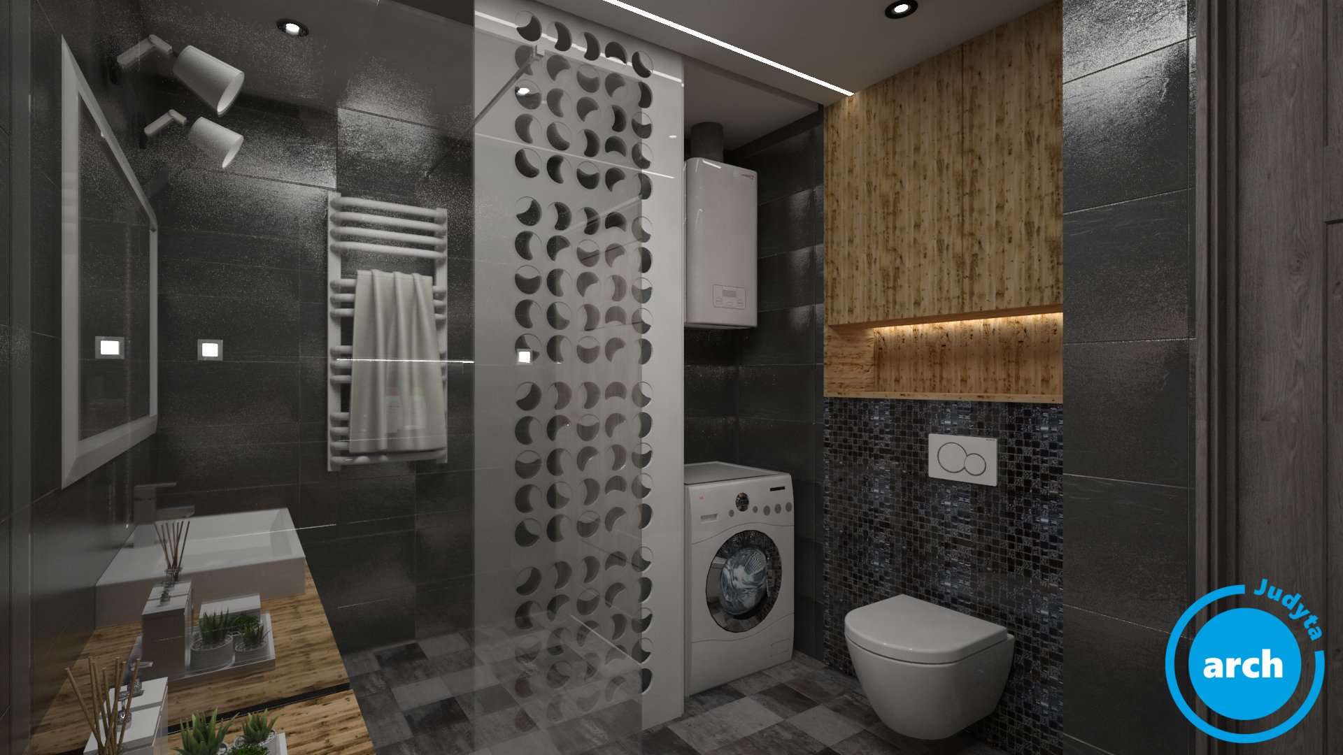 125. lazienka czarna prysznic szyba drewno mozaika zabudowana pralka bathroom black shower glass mosaic