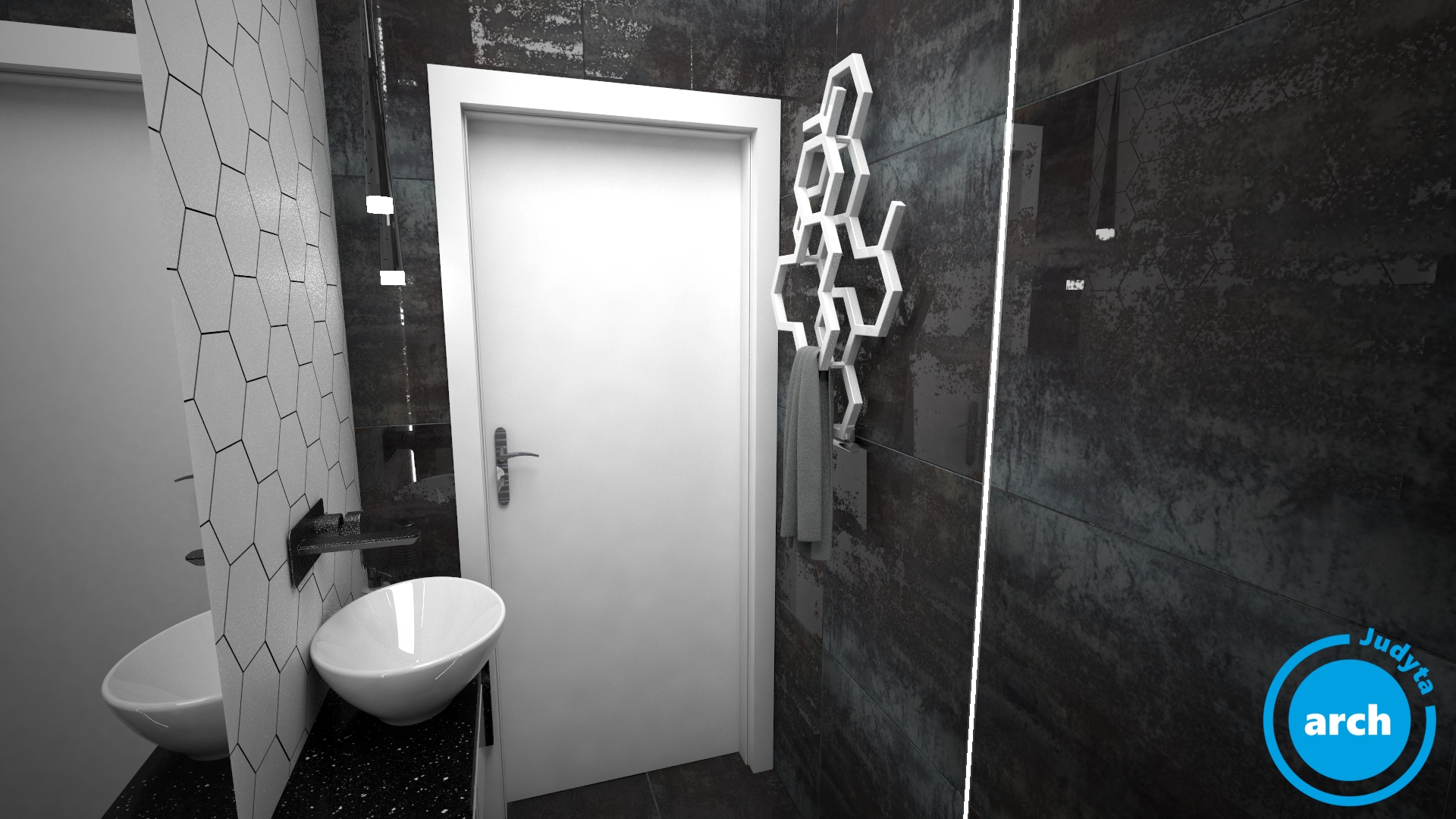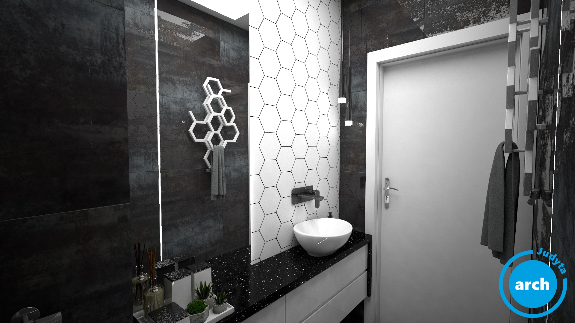 132. mala lazienka czarny srebrny hexagony bialy small bathroom black silver white hexagons