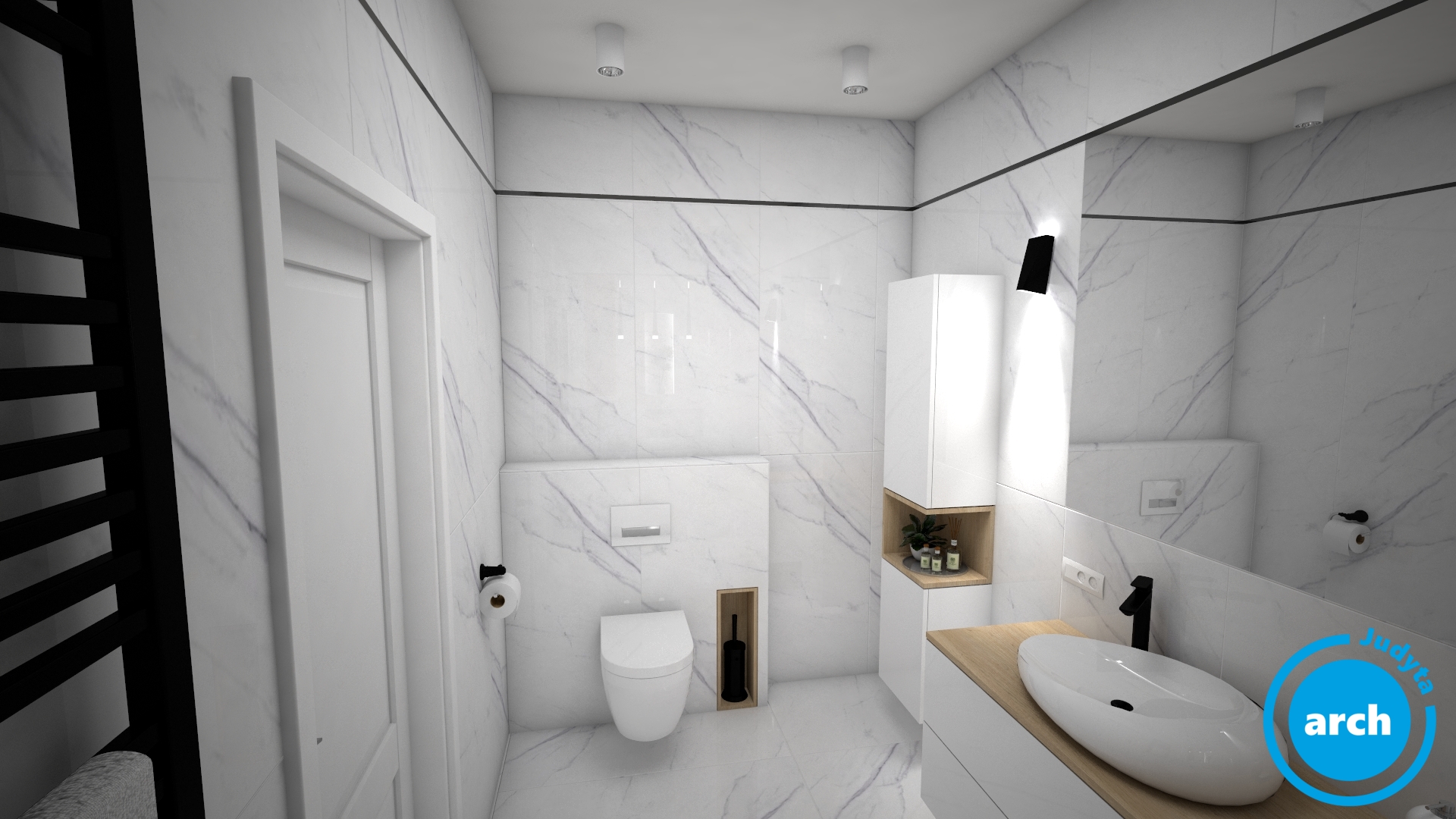 0099. lazienka w szarościach i bielach z czarna armatura bathroom grey and white with black sink