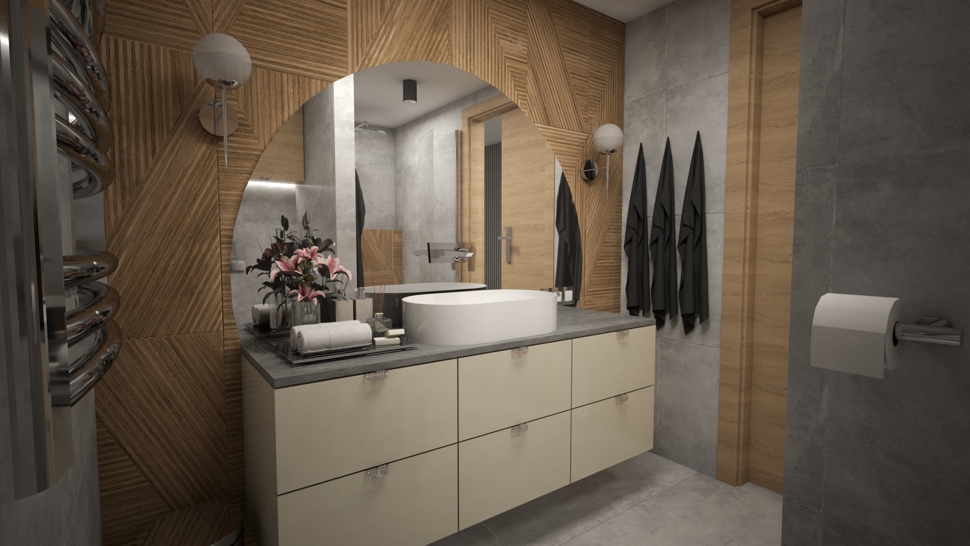 0035. łazienka szare płytki z drewnem umywalka nablatowa