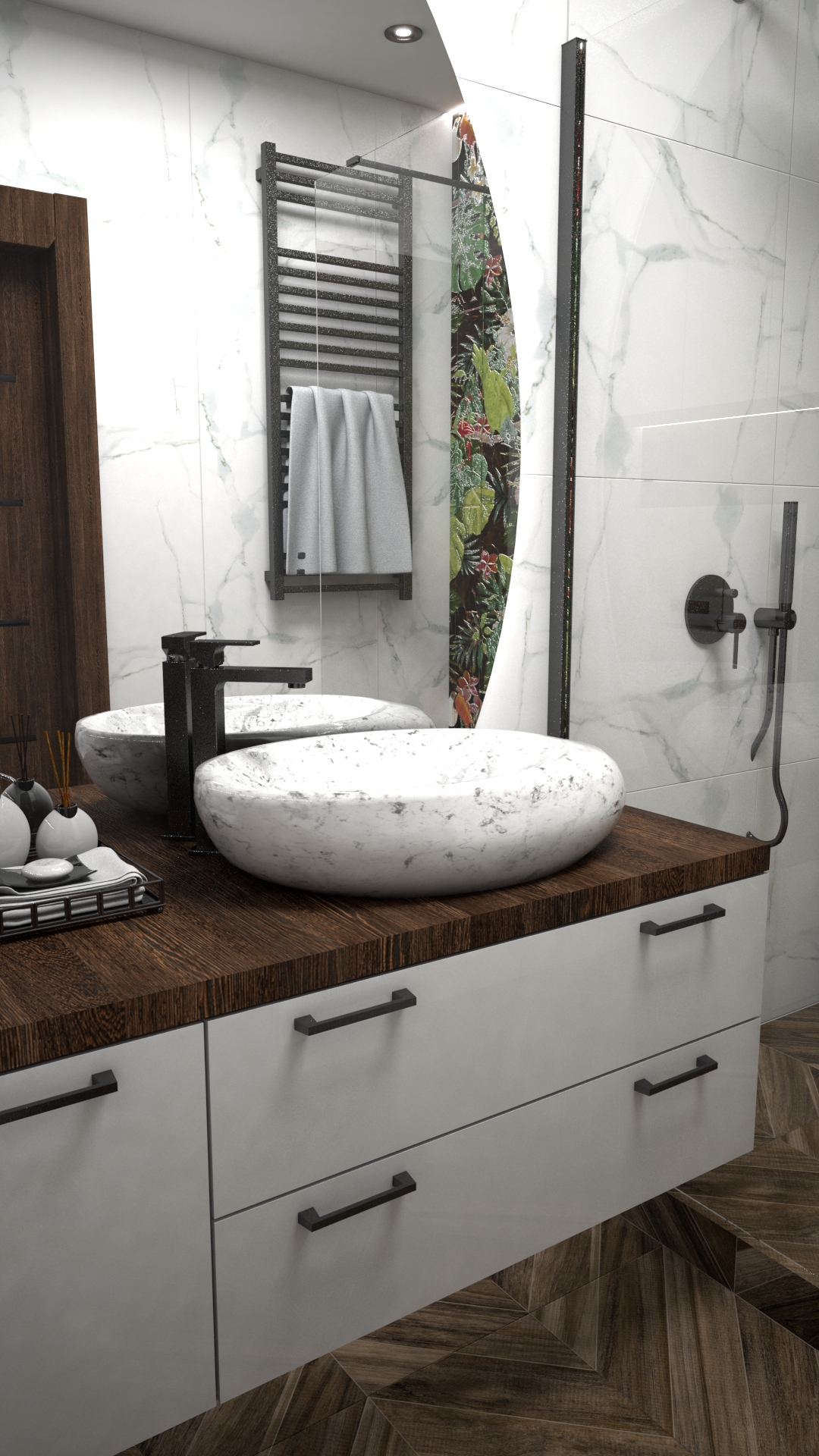 207.-lazienka-marmur-carrara-biala-drewno-umywalka-nablatowa-czane-baterie-dekor-jungle