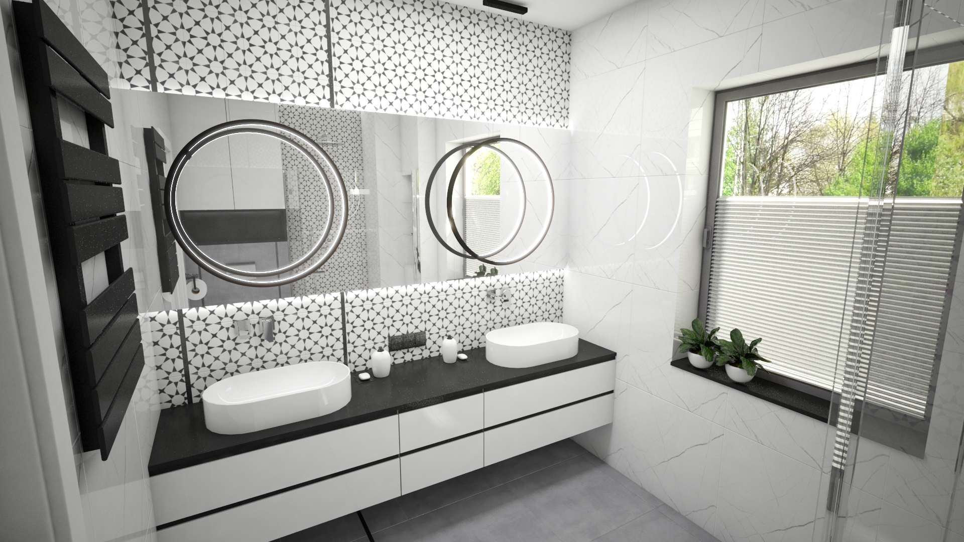 231.-lazienka-czarno-biala-patchwork-prysznic-dwie-umywalki-okrągłe-lampy